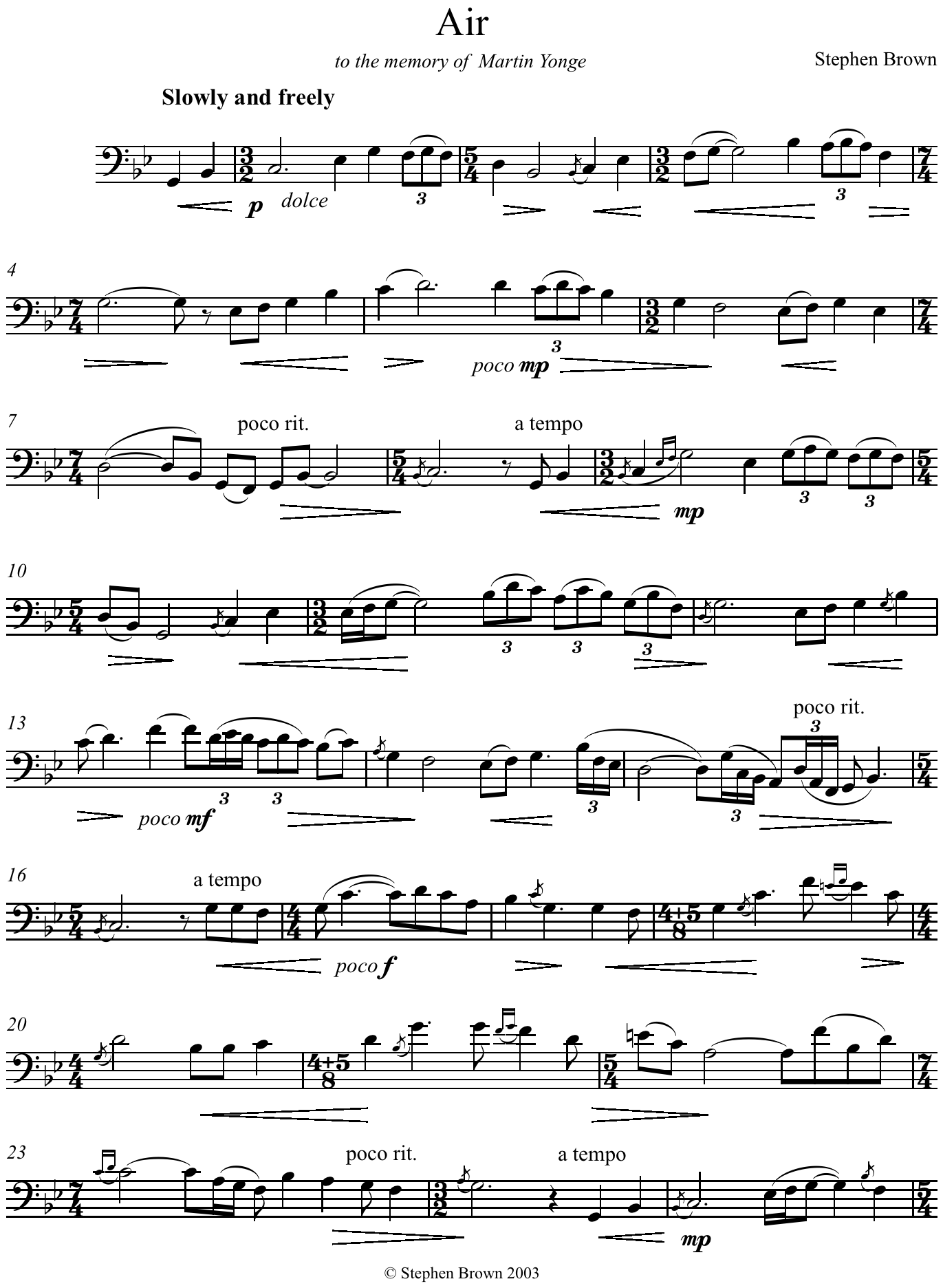 A four movement suite (Air, Strathspey & Reel, Slow Waltz, and Jig) for solo flute. Commissioned by Janet Bazett and dedicated to the memory of her brother, Martin Yonge. Premiere of the Air and Strathspey by Janet Bazett at a memorial service for Martin Yonge, Takakkaw Falls, B.C., July. 26, 2003