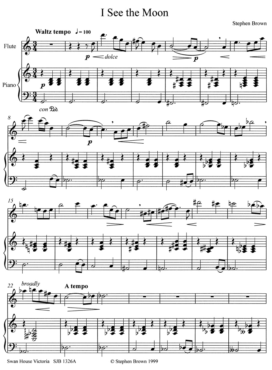 I See the Moon is Movement No. 2 from Where the Geese Go Barefoot. It exists in arrangements for flute, or clarinet, or violin with a piano or guitar accompaniment. This special arrangement was done by Viveza for their latest CD "In Concert".
