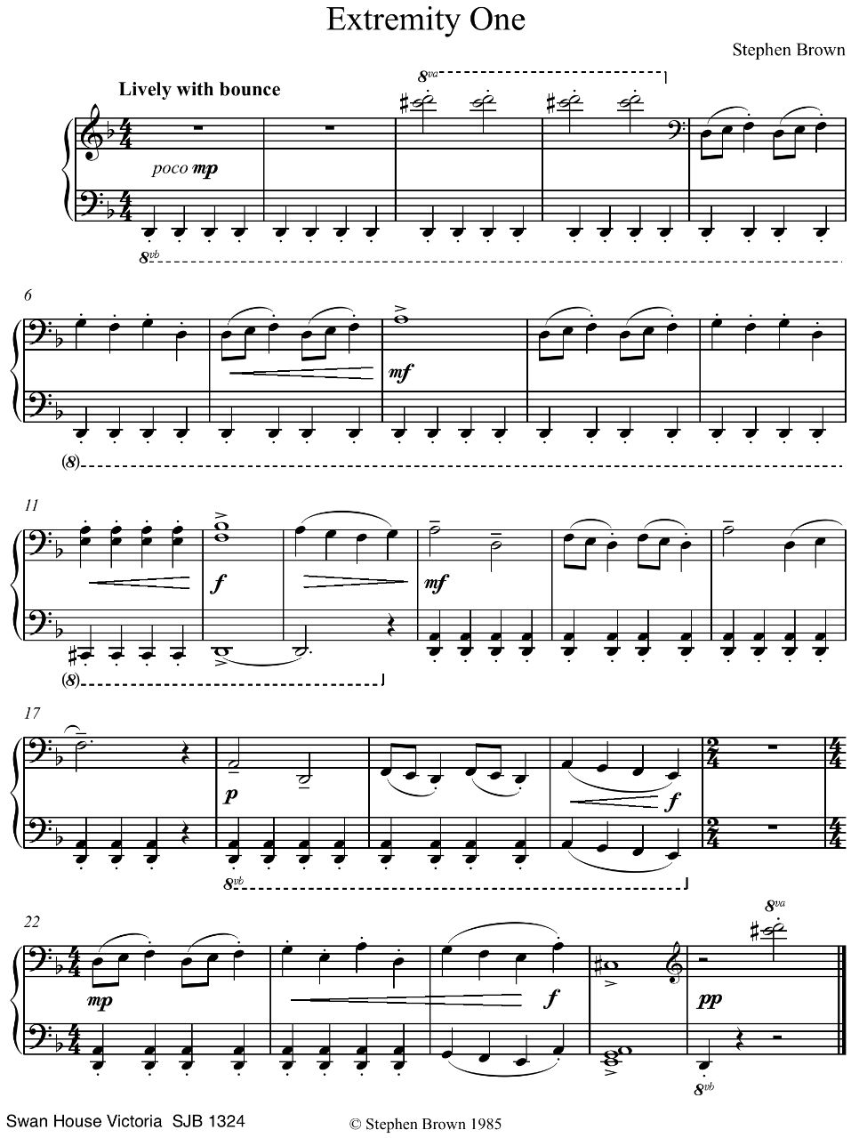 Five piece for piano solo using the full keyboard. Can be played individually or as a set. Extremity No. 1 is published by Waterloo Music Publications as part of a group of piano pieces called Diamond Jubilee Collection by C.F.R.M.T.A. composers. The Diamond Jubilee Collection is available on CD, Valery Lloyd-Watts - piano. Difficulty: junior-intermediate.